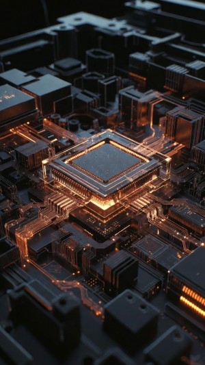 Advanced microchip processor with glowing amber circuitry