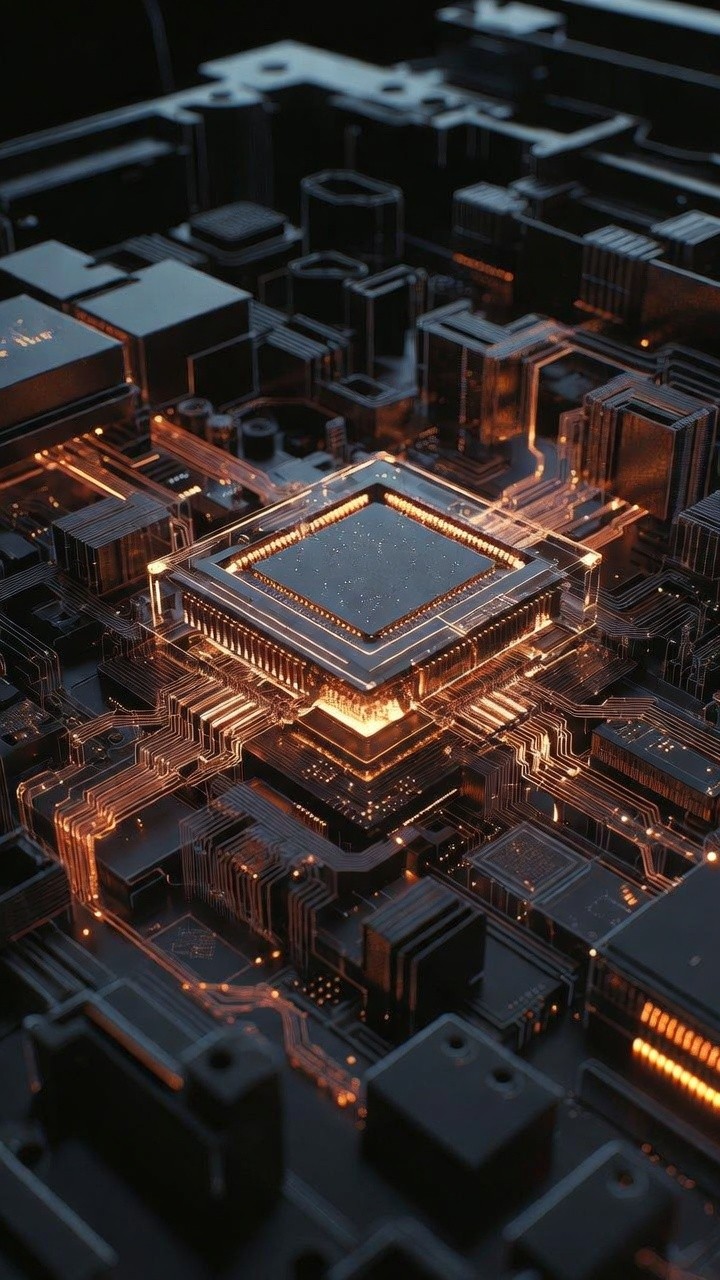 A highly detailed 3D isometric macro shot of a futuristic computer processor at the center of a complex motherboard. The central square chip is illuminated from within, casting a warm amber glow that flows through intricate, raised circuit pathways. The surrounding components are rendered in matte black and dark grey, featuring sharp geometric layers and architectural precision. The lighting emphasizes the depth and complexity of the hardware, creating a high-tech aesthetic that suggests immense processing power and advanced digital engineering.