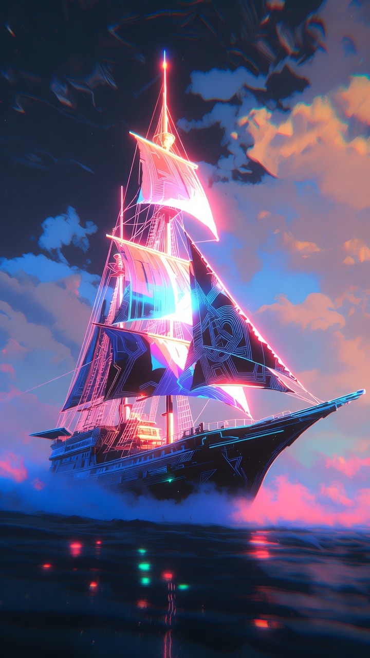 Set sail into a retro-futuristic dream with this breathtaking live wallpaper! This mesmerizing loop features a majestic sailing ship reimagined with vibrant, glowing neon sails. Drifting through a surreal twilight filled with pink and purple clouds, the ship's geometric lights reflect beautifully across the dark, rippling ocean. It is the perfect blend of a vaporwave aesthetic and epic adventure, guaranteed to give your lock screen a bold, cyberpunk-inspired glow.